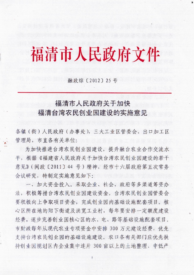 福清市人民政府关于加快福清台湾农民创业园建设的实施意见 -尊龙凯时入口