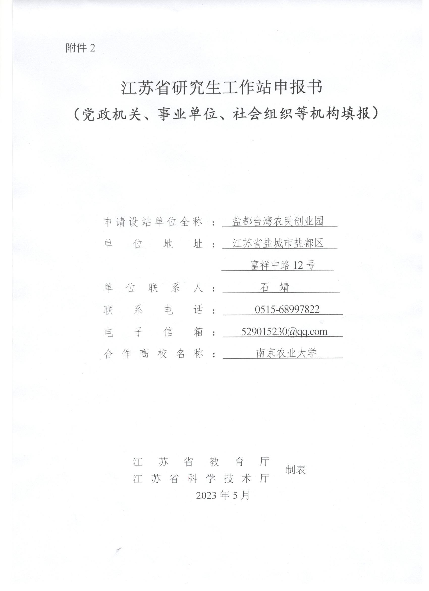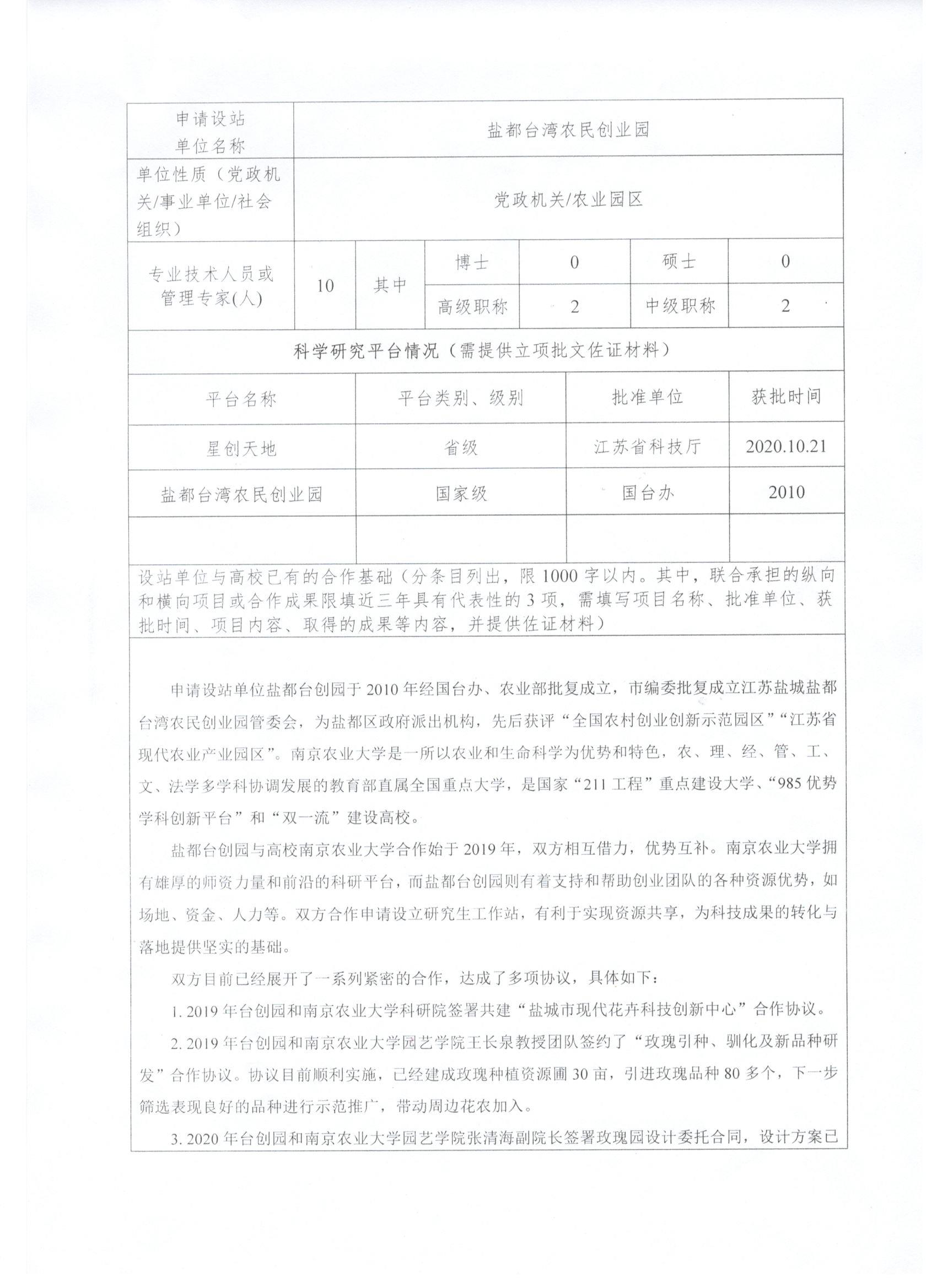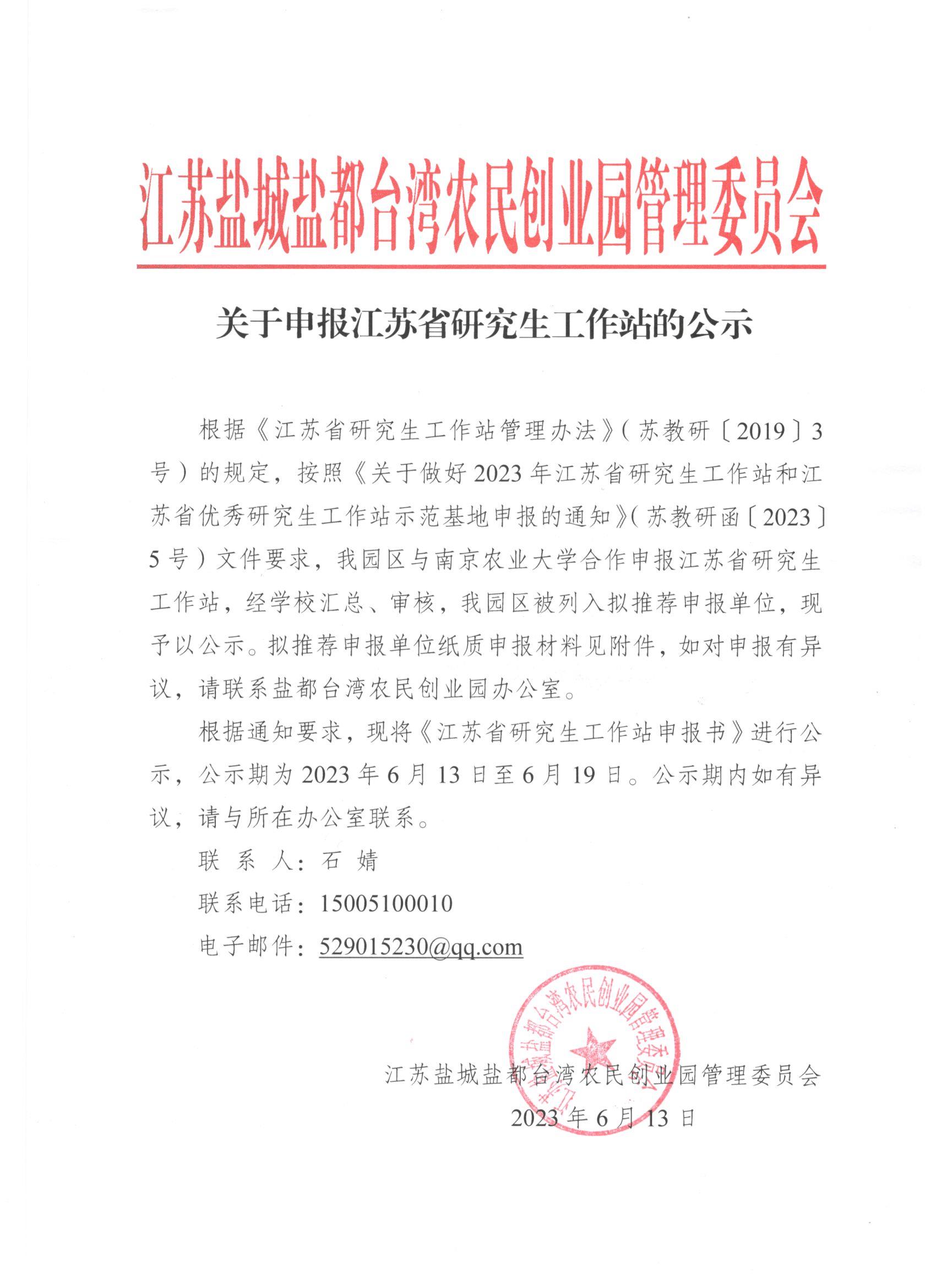 根据《江苏省研究生工作站管理办法》(苏教研〔2019〕3号)的规定,按照《关于做好2023年江苏省研究生工作站和江苏省优秀研究生工作站示范基地申报的通知》(苏教研函〔2023〕5号)文件要求,我园区与南京农业大学合作申报江苏省研究生工作站,经学校汇总、审核,我园区被列入拟推荐申报单位,现予以公示。拟推荐申报单位纸质申报材料见附件,如对申报有异议,请联系盐都台湾农民创业园办公室。