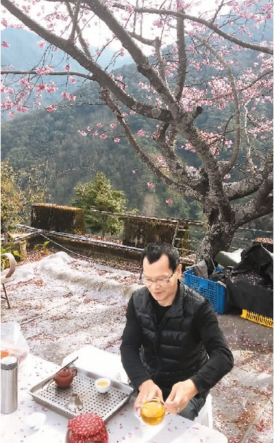 阿里山茶区的一位茶农在自家茶园泡茶。