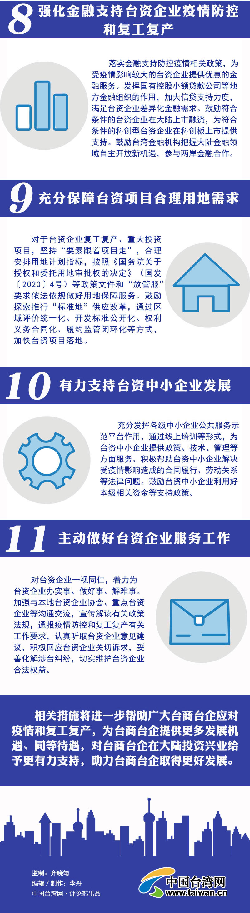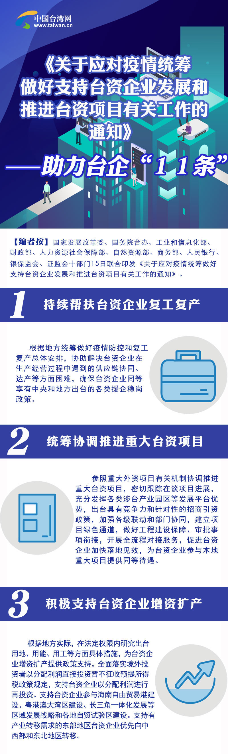 15日,国家发展改革委、国务院台办、工业和信息化部等十部门联合印发了助力台企“11条措施”。相关措施将进一步帮助广大台商台企应对疫情和复工复产,为台商台企提供更多发展机遇、同等待遇,对台商台企在大陆投资兴业给予更有力支持。